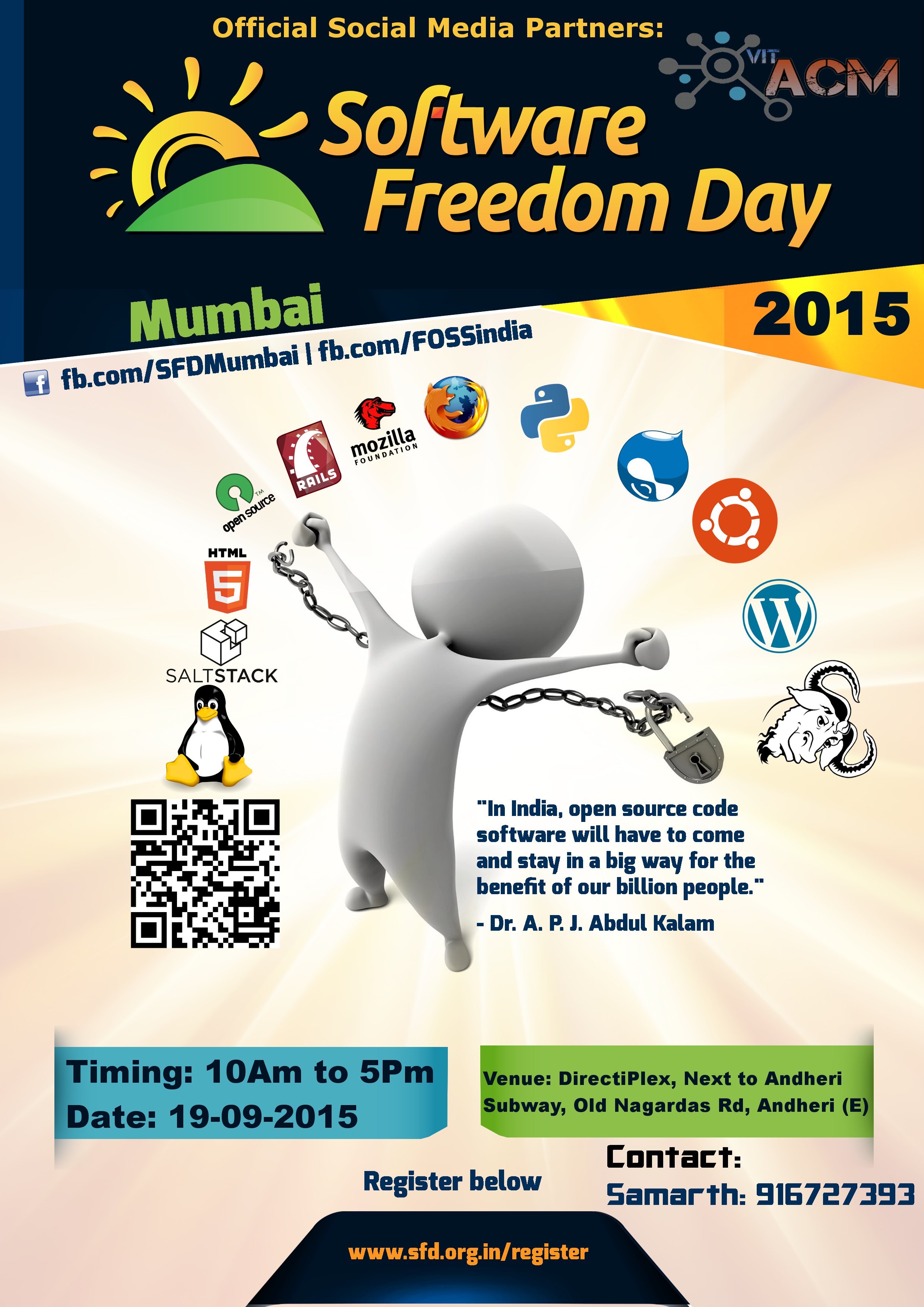 FOSSIndia Group, a community supported by prominent organizations like Google Developer Group, Mumbai and Mozilla, is organizing Software Freedom Day Mumbai 2015. As part of it, there'll be workshops and lectures on topics like Firefox OS security, Digital Forensics, Open Source Softwares and much more. They will be taken by celebrated professionals of respective fields. Participants will also get certificates.
